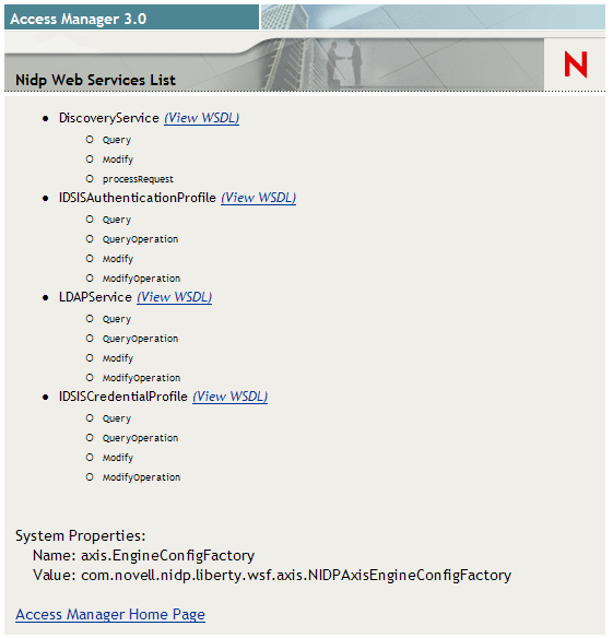 Users can access the WSDL service page when they enter the Base URL of the Identity Server in their browsers with the path to the Services page. For example, if your base URL is http://bfrei.provo.novell.com:8080/nidp, the users can access the services page with the following URL: