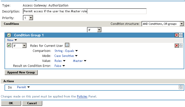 After you have saved the Authorization policy, you need to assign it to the protected resource or resources that require the Master role, then update the Access Gateway.