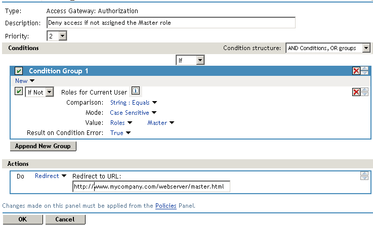 The second rule in the policy should deny access to those who are not assigned the Master role and should redirect them to the page where they can request access. You can do this with a rule that checks to see if they are assigned the Master role. In this type of rule, the condition needs to be an condition.