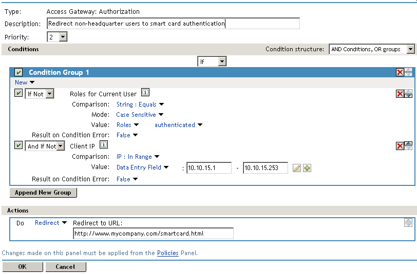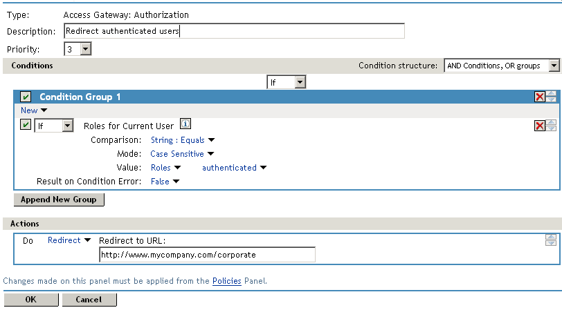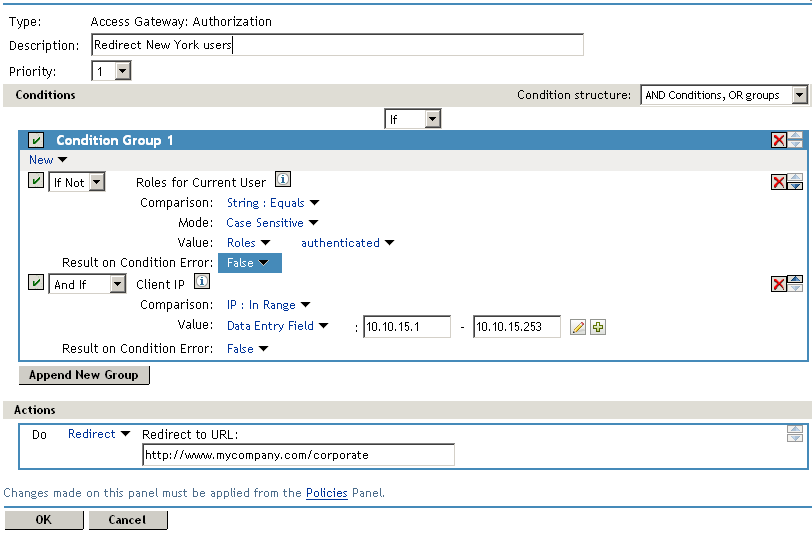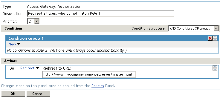 This sample policy can only be created as an Access Gateway Authorization policy because it relies on a redirect action.