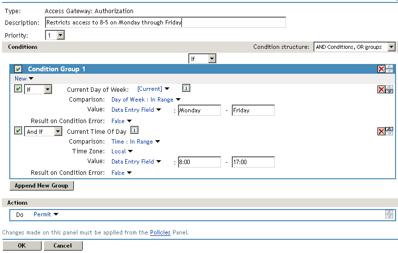 If you have an application or data that is highly sensitive, you might want to limit access so that it is only available during core work hours, for example Monday through Friday from 8:00 a.m. to 5:00 p.m. This type of policy can be created as either an Access Gateway Authorization policy or as a J2EE Agent Authorization policy.