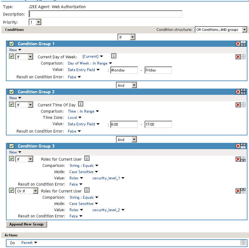 The following samples are provided so you can comprehend the variety of ways you can use the conditions to control access. The biggest difference between a J2EE Agent Authorization policy and an Access Gateway Authorization policy is that an Access Gateway Authorization policy allows a redirect action. J2EE Agent Authorization policies allow only a deny or permit action.