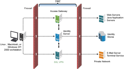This deployment scenario consists of a demilitarized zone, where the Access Gateway, Identity Server, and SSL VPN are deployed separately. For installation instructions for this scenario, see Section 7.3.3, Deployment Scenario 2: Installing SSL VPN on a Separate Machine.