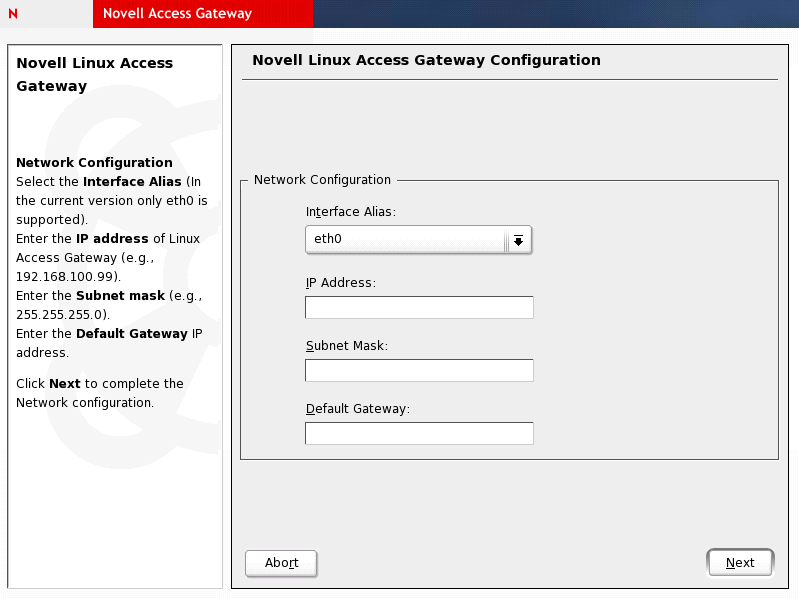 Interface Alias: This option displays the eth0 interface that is configured by default. The Standard Installation does not support configuring multiple interfaces. Only the eth0 interface can be configured during the install. You can configure multiple interfaces by using the Administration Console after installation. For more information, see Section A.2.2, Manually Configuring a Network Interface.