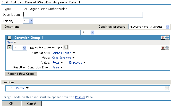 The following scenario explains how to set up Access Manager policies that permit Managers to access the manager pages in the sample payroll application, deny Employees access to the manager pages, but permit Employees and Managers access to their own information pages. These policies do not require any J2EE server configuration to correctly enforce the policies.
