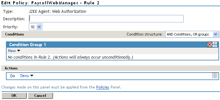To create a generic deny rule, assign a deny action, then click OK. Your rule should look similar to the following:
