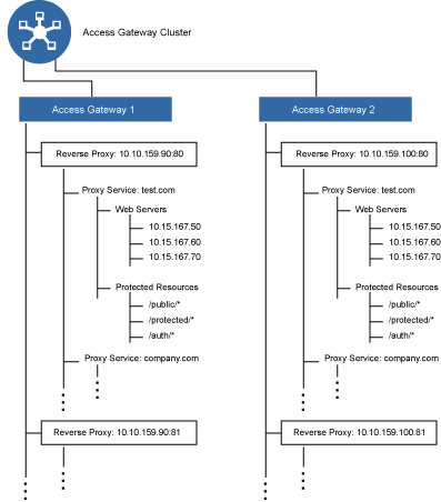 In Figure 6-1, Access Gateway 1 and Access Gateway 2 have the same configuration except for the reverse proxy listening address. They share the other configuration settings because they are members of an Access Gateway cluster. This section explains how to create a group of Web servers, how to add multiple proxy services and reverse proxies to an Access Gateway, and how to manage a cluster of Access Gateways.