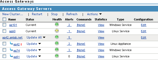 For information about monitoring the health or statistics of a cluster, see Section 4.8.3, Viewing the Health of an Access Gateway Cluster and Section 4.5, Viewing Cluster Statistics.