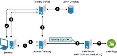 The Access Gateway uses an Identity Injection policy to insert the basic authentication credentials in the HTTP header of the request and sends it to the Web server.