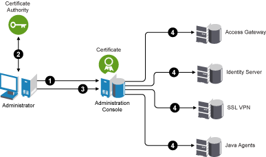 Access Gateway: Uses server certificates and trusted roots to protect Web servers, provide single sign-on, and enable the product’s data confidentiality features, such as encryption. They are used for background communication with the Identity Server and policy engine and to establish trust between the Identity Server and the Access Gateway.