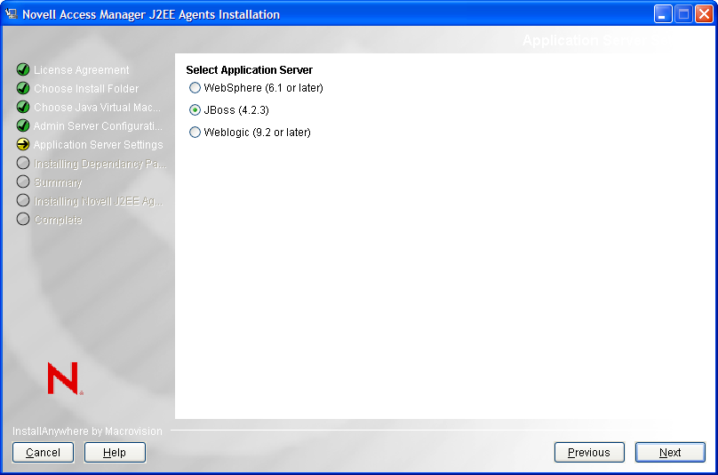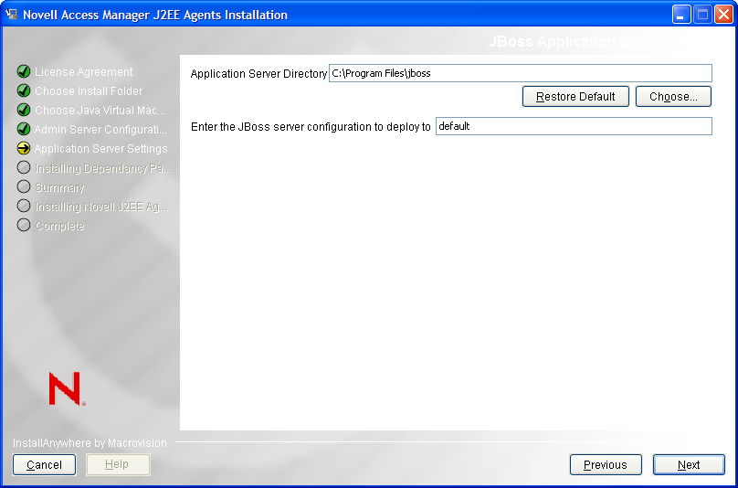 The Novell J2EE Agents depend on the JBoss Web deployer service in order to use a custom JBoss configuration. The JBoss Web deployer service must be already installed before you proceed with the installation of the Novell J2EE Agents.