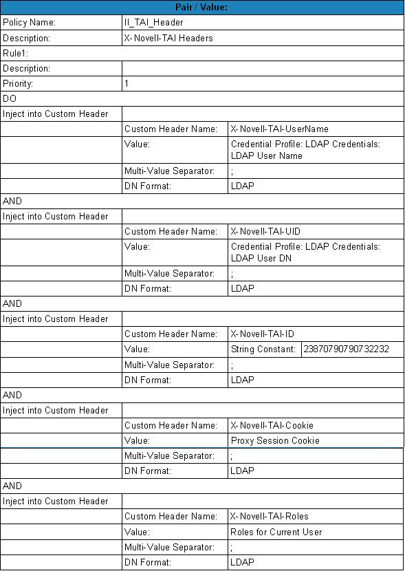 Novell Access Manager passes all required details to the TAI module via the HTTP header.There are three places where configuration is required: