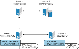 You configure the Access Manager so that a user can access a resource on a Web server whose name and address are hidden from the user. This basic configuration sets up communication between the following four servers.