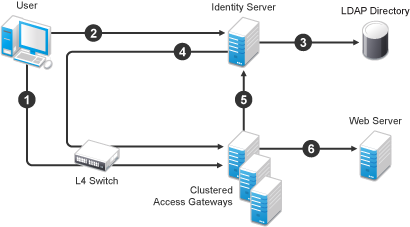 The user requests access to a protected resource by sending a request to the L4 switch. The request is sent to one of the Access Gateway servers in the cluster.