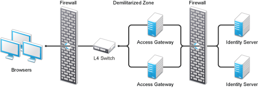 With this configuration, you need an L4 switch to cluster the Access Gateways. However, you do not need an L4 switch to cluster the Identity Servers. When the Identity Server is configured to be a protected resource of the Access Gateway, the Access Gateway uses its Web server communication channel. Each Identity Server in the cluster must be added to the Web server list, and the Access Gateway uses its Web server load balancing and failover policies for the clustered Identity Servers.