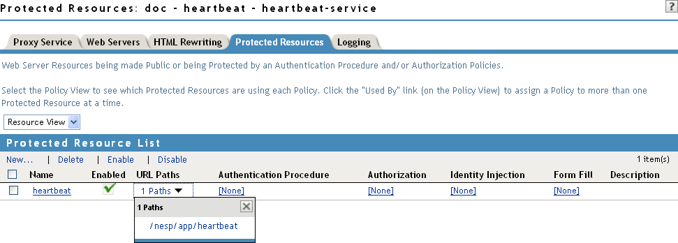 Click twice. Your protected resource for the heartbeat application should look similar to the example below.