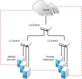 Switches: When you install an L4 switch, you can plug the machines directly into the L4 switch or plug them into an inner switch that is plugged into the L4 switch. When you use inner switches with an L4 switch, you must use at least two inner switches, one for the Identity Servers and one for the Access Gateways. An Identity Server and an Access Gateway cannot share the same inner switch. Such a configuration causes communication problems because the Access Gateway and the Identity Server try to establish direct communication with each other rather than routing all traffic through the L4 switch.
