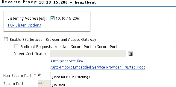 You configure the Access Gateway to listen on the same IP address as the service using port 443. For non-SSL, port 81 is recommended. Do not use port 80.