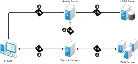 You were instructed to set the first channel between the Identity Server and the LDAP servers when you configured the user stores (see Step 10 in Section 1.3, Creating a Basic Identity Server Configuration). The other channels need to be configured according to their numeric values. You need to configure SSL between the Identity Server and the browsers before you configure the channel between the Access Gateway and the Identity Server for SSL.