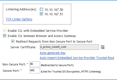 If you enable SSL between the browsers and the Access Gateway, this option is automatically selected for you. You can enable SSL with the embedded service provider without enabling SSL between the Access Gateway and the browsers. This allows the authentication and identity information that the Access Gateway and the Identity Server exchange to use a secure channel, but allows the Access Gateways to use non-secure channels with the browsers and the Web servers. This saves processing overhead if the data on the Web servers is not sensitive.