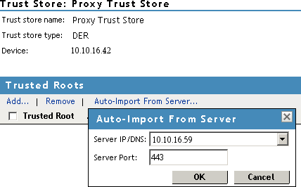 The configCA public key certificate of the Access Manager CA is automatically added to the ESP Trust Store. If you are using Access Manager CA certificates for the Identity Server, you do not need to import the configCA certificate unless someone has deleted it from this trust store.
