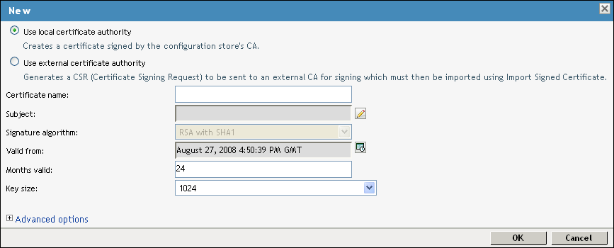 This option creates a certificate signed by the local CA (or Organizational CA), and creates the private key.
