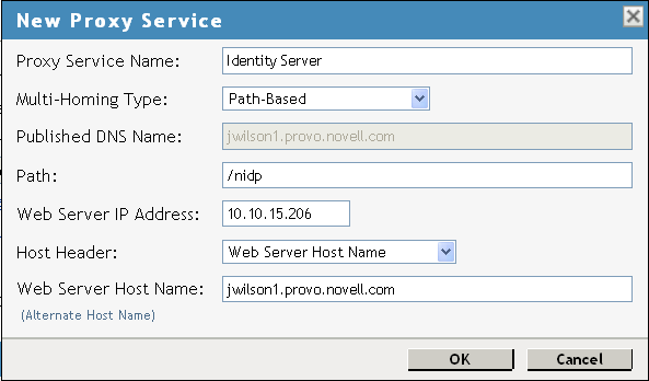 For example, if your proxy service has a public DNS name of jwilson1.provo.novell.com, that is the name you must specify for the Base URL.