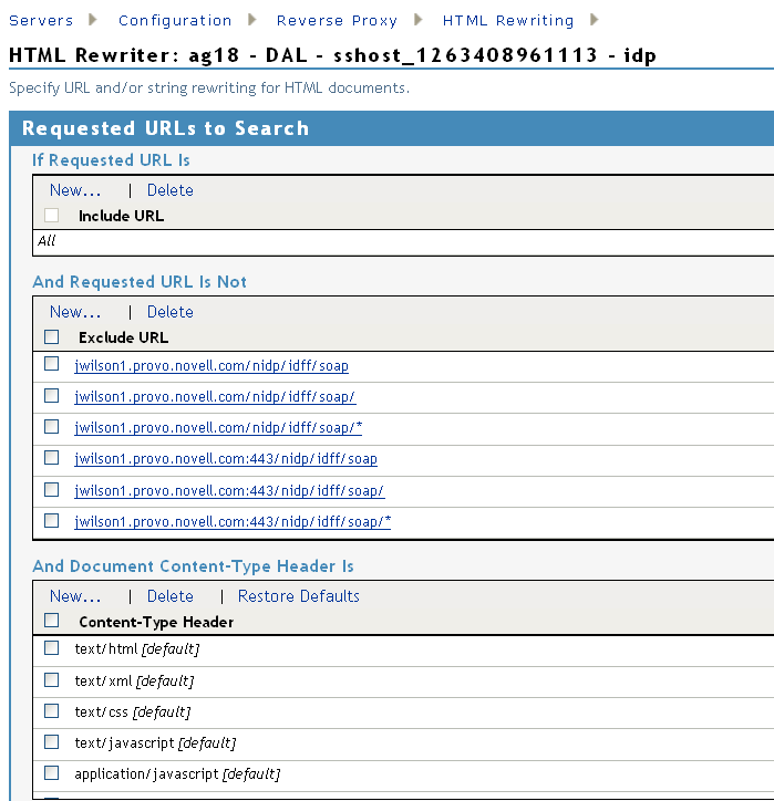 Specify the following URLs in the section. The following URLs use jwilson1.provo.novell.com/nidp as the DNS name of the reverse proxy for the Identity Server.