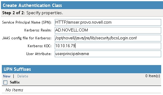 Service Principal Name (SPN): Specify the value of the servicePrincipalName attribute of the Identity Server user. For this example configuration, this is HTTP/amser.provo.novell.com.