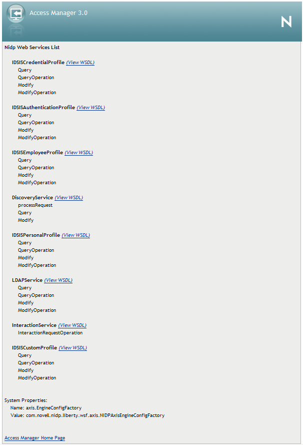 Users can access the WSDL services page when they enter the base URL of the Identity Server in their browsers with the path to the Services page. For example, if your base URL is http://bfrei.provo.novell.com:8080/nidp, the users can access the services page with the following URL: