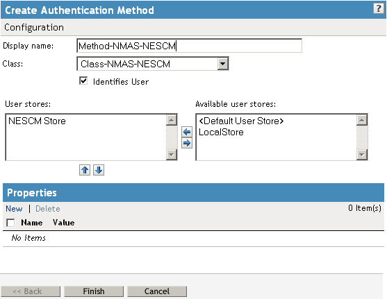 When creating a method, you can specify property values that are applied to just this method and not the entire class. In this tutorial, we want the method to use the same login sequence as the class. The method also allows you to specify which user stores can use the method. For a smart card method, you need to ensure that the user store or stores specified for the method have NESCM installed.