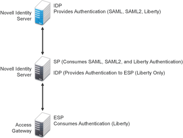 An Identity Server can be configured as an identity provider, which allows other service providers to trust it for authentication. It can also be configured as a service provider, which enables the Identity Server to consume authentication assertions from trusted identity providers. Figure 7-1 depicts two Identity Servers. The Identity Server at the top of the figure is configured as an identity provider for SAML 1.1, SAML 2.0, and Liberty authentication. The Identity Server in the middle of the figure is configured as a service provider, consuming the authentication credentials of the top Identity Server. This second Identity Server is also configured as an identity provider, providing authentication for the Embedded Service Provider of the Access Gateway.