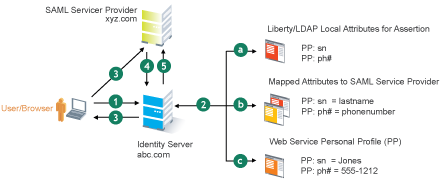 The server looks up LDAP or Liberty-LDAP mapped attributes. (See Section 13.6, Mapping LDAP and Liberty Attributes.) In this example, you use Liberty attributes such as PP: sn instead of surname. PP: sn and PP: ph# are attributes that you are sending to xyz.com.