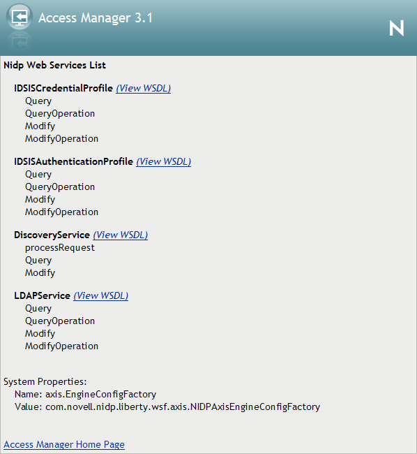 Users can access the WSDL services page when they enter the base URL of the Identity Server in their browsers with the path to the Services page. For example, if your base URL is http://bfrei.provo.novell.com:8080/nidp, the users can access the services page with the following URL:
