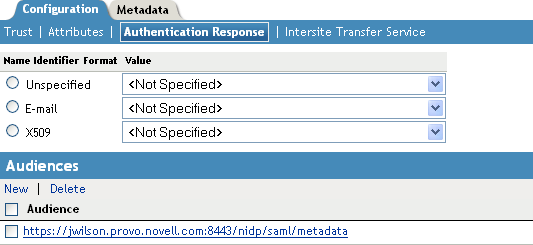 When the Identity Server receives an authentication request from a trusted service provider, the request contains the conditions that the Identity Server needs to fulfill. The Authentication Response page allows you to configure how you want the Identity Server to fulfill the binding and name identifier conditions of the request, or for SAML 1.1, respond to the Intersite Transfer Service. For configuration information, see one of the following: