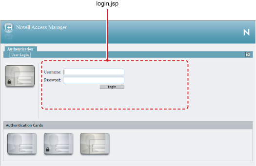 You can use the nidp.jsp file to customize the header with the Novell Access Manager product name and the Novell logo. The menus.jsp file controls the and tabs. The login.jsp file controls the credential frame with username and password. The content.jsp file controls what is displayed on the page, including the available authentication cards.