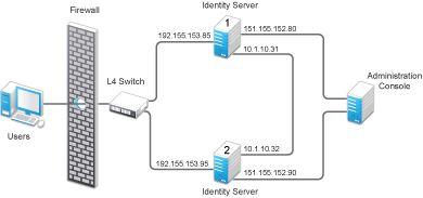 Figure 14-1 illustrates a configuration with a two-member cluster. The L4 switch sends client traffic to the Identity Servers by using the IP addresses that start with 192. The IP addresses that start with 10 are used to route proxied requests to the cluster members. The IP addresses starting with 151 are used for the management traffic with the Administration Console.