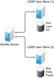 You can configure the Identity Server to search more than one user store during authentication. Figure 3-2 illustrates this type of configuration.