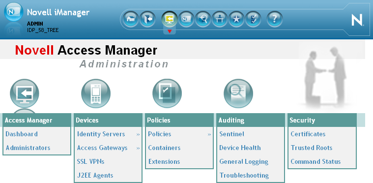 WARNING:The Administration Console is a combination of iManager and a device manager. It has been customized for Access Manager so that it can manage the Access Manager components.