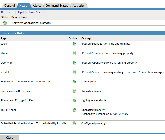 The initial health status of an ESP-enabled SSL VPN shows yellow because the trust relationship between the Identity Server and the Embedded Service Provider is yet to be established. For more information on how to configure the trust relationship, see Configuring Authentication for the ESP-Enabled Novell SSL VPN