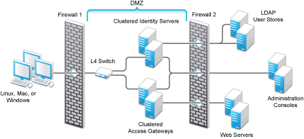 End users can be configured to communicate with the Identity Servers and Access Gateways through HTTP or HTTPS. The Access Gateways can be configured to communicate with the Web servers through HTTP or HTTPS. The multiple Administration Consoles provide administration and configuration redundancy.