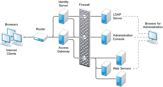 For a basic Access Manager installation, you can install the Identity Server and the Access Gateway outside your firewall. Figure 3-1 illustrates this scenario: