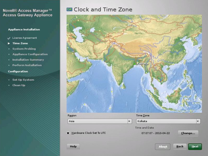 Review the agreement on the License Agreement page, then click to accept the agreement. The Clock and Time Zone page is displayed.