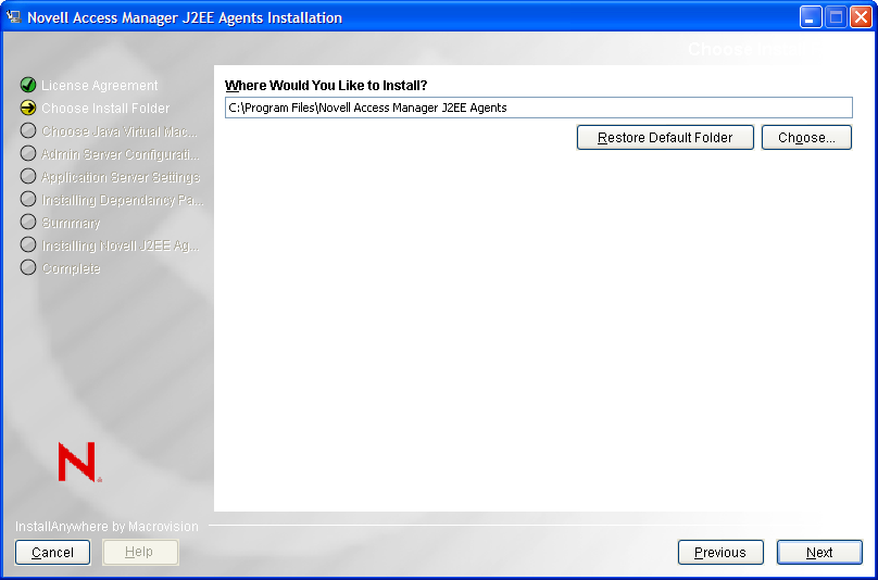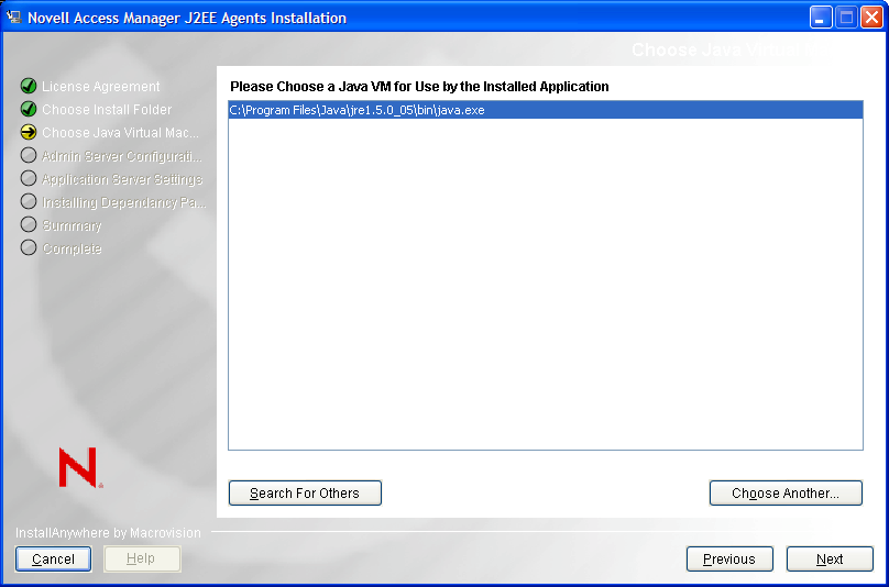 Select a directory to install the Novell J2EE agent components, then click . The Choose a Java Virtual Machine page is displayed.