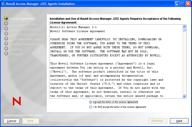 Specify an absolute path to install the Novell J2EE agent components, or press Enter to continue with the default installation path.