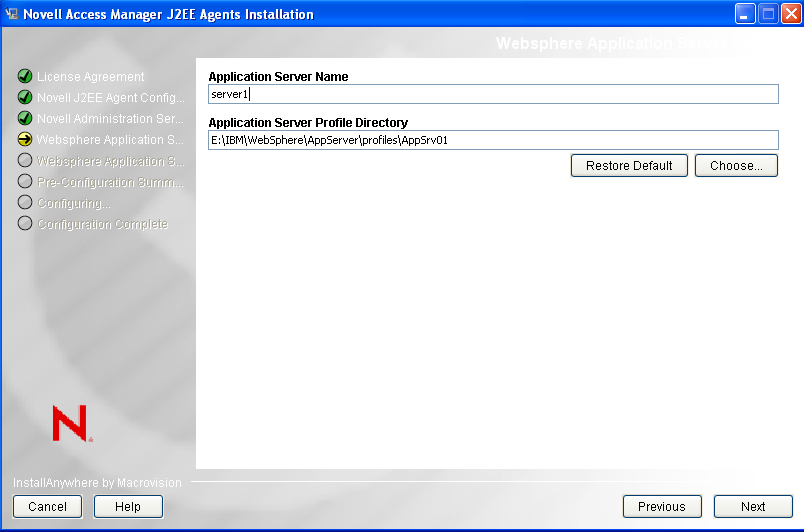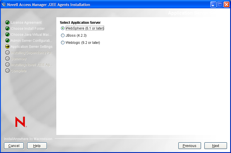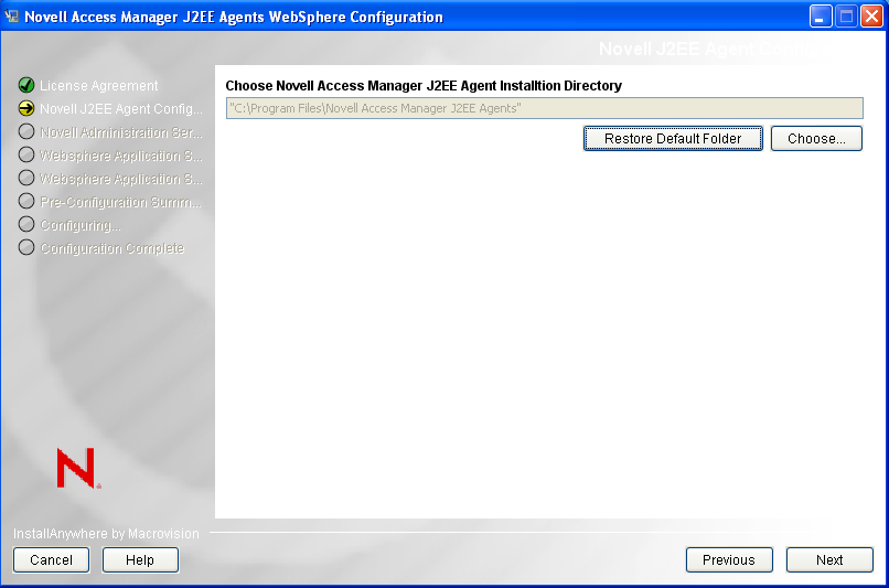 Review the License Agreement, accept it, then click . The Novell J2EE Agent Configuration page is displayed.