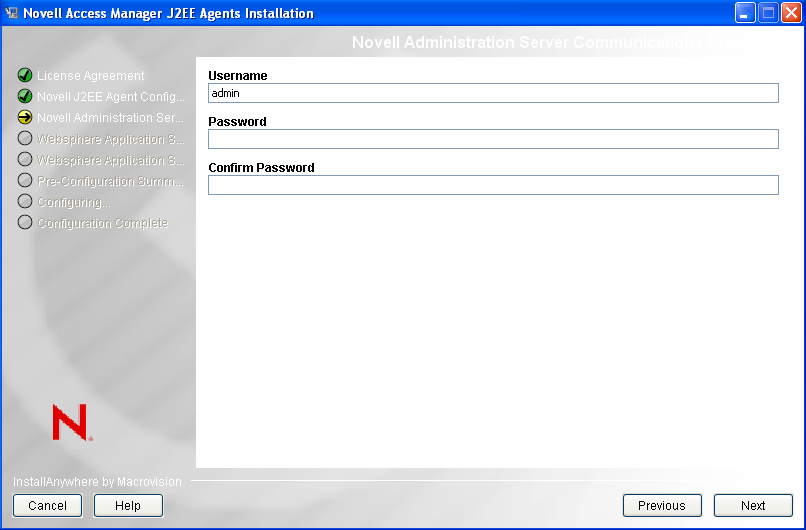 Specify the username and password of the admin user of the Novell Access Manager Administration Console. Confirm the password by re-entering it.