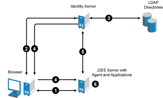 When you configure the Identity Server to provide authentication for the applications on the J2EE server, the communication process follows the paths illustrated in Figure 2-1.