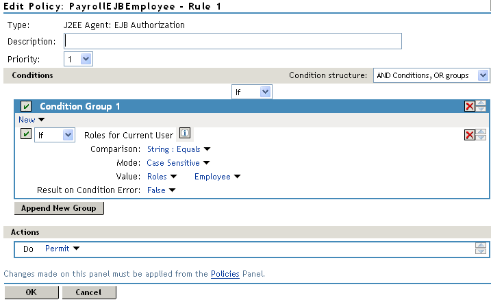 If you have a particular application that requires more than one role, and it is the only application using these roles, you might want to create one role policy that assigns users to the required roles. The following steps explain how to create one role policy that assigns users to the Manager role and the Employee role.