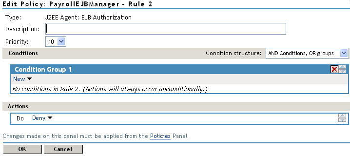 To create a generic deny rule, assign a deny action, then click OK. Your rule should look similar to the following: